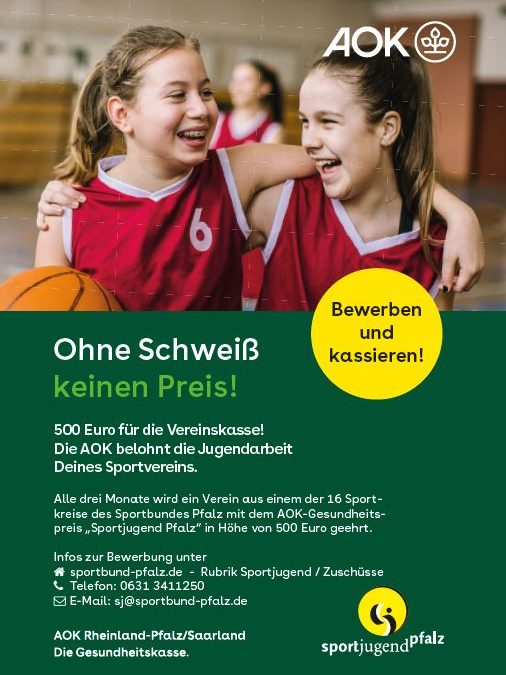 Die Jugend des 1. FC Hambach erhält am Mittwoch, 11. Mai 2022, 14.30 Uhr auf der Vereinsanlage im Diedesfelder Weg 89 in 67434 Neustadt den mit 500 Euro dotierten AOK-Gesundheitspreis „Sportjugend Pfalz“. Mit diesem Preis belohnt die AOK Rheinland-Pfalz/Saarland in Kooperation mit der Sportjugend Pfalz die engagierte Jugendarbeit der Sportvereine. Die Übergabe erfolgt durch AOK-Teamleiter Volker Brendel mit der AOK-Gesundheitsmanagerin Ute Alter. Die Sportjugend ist vertreten durch den Jugendsekretär Peter Conrad.