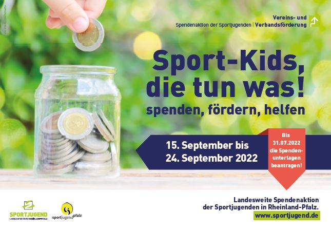 Auch in diesem Jahr veranstaltet die Sportjugend in Rheinland-Pfalz in Zusammenarbeit mit ihren regionalen Sportjugenden vom 15. bis 24. September 2022 ihre eigene Jugendspendenaktion. Unter der Schirmherrschaft des Ministers des Innern und für Sport , Roger Lewentz, können alle Sportvereine in Rheinland-Pfalz teilnehmen und ihren Ideen zum Sammeln von Geldern für soziale Projekte aber auch zur Aufstockung der eigenen Jugendkasse von freien Lauf lassen. Mit diesem Engagement stellt die Sportjugend einmal mehr ihre große gesellschaftspolitische Bedeutung und die Solidarität mit sozial benachteiligten Jugendlichen unter Beweis. Anmeldung bitte bis 31.07.2022.