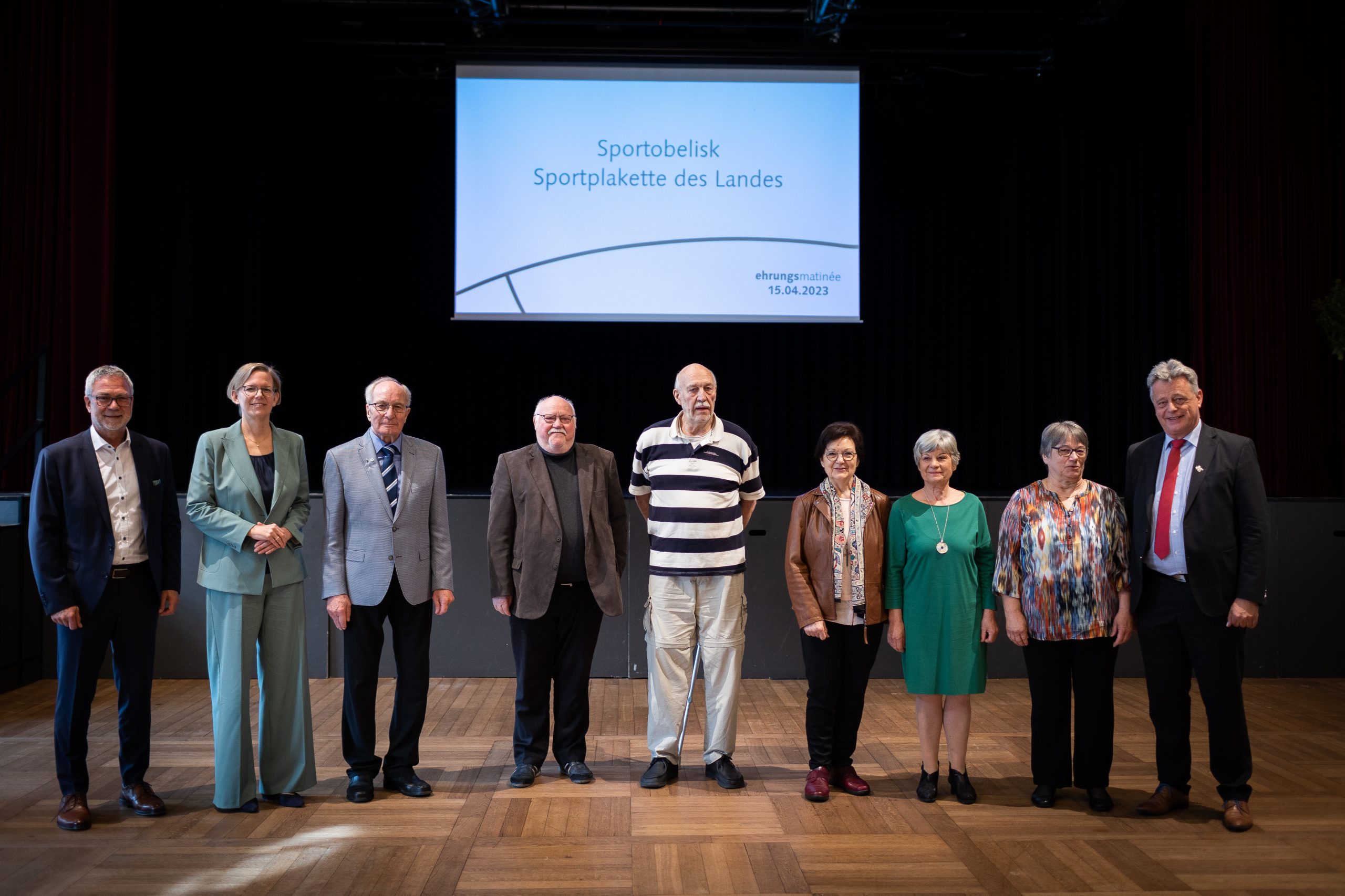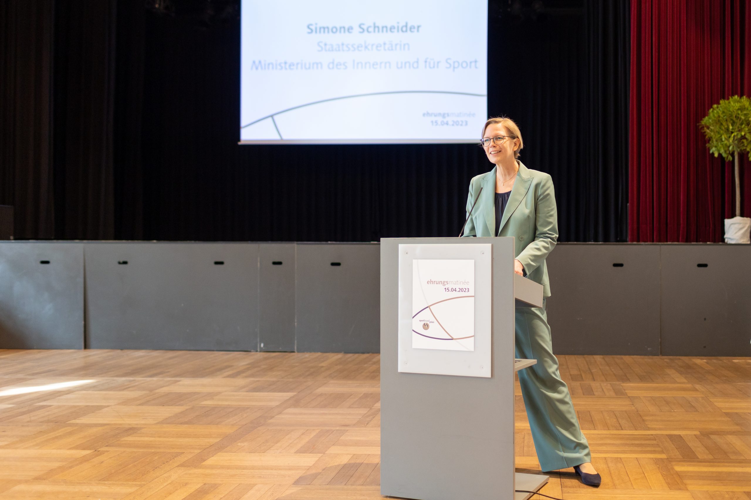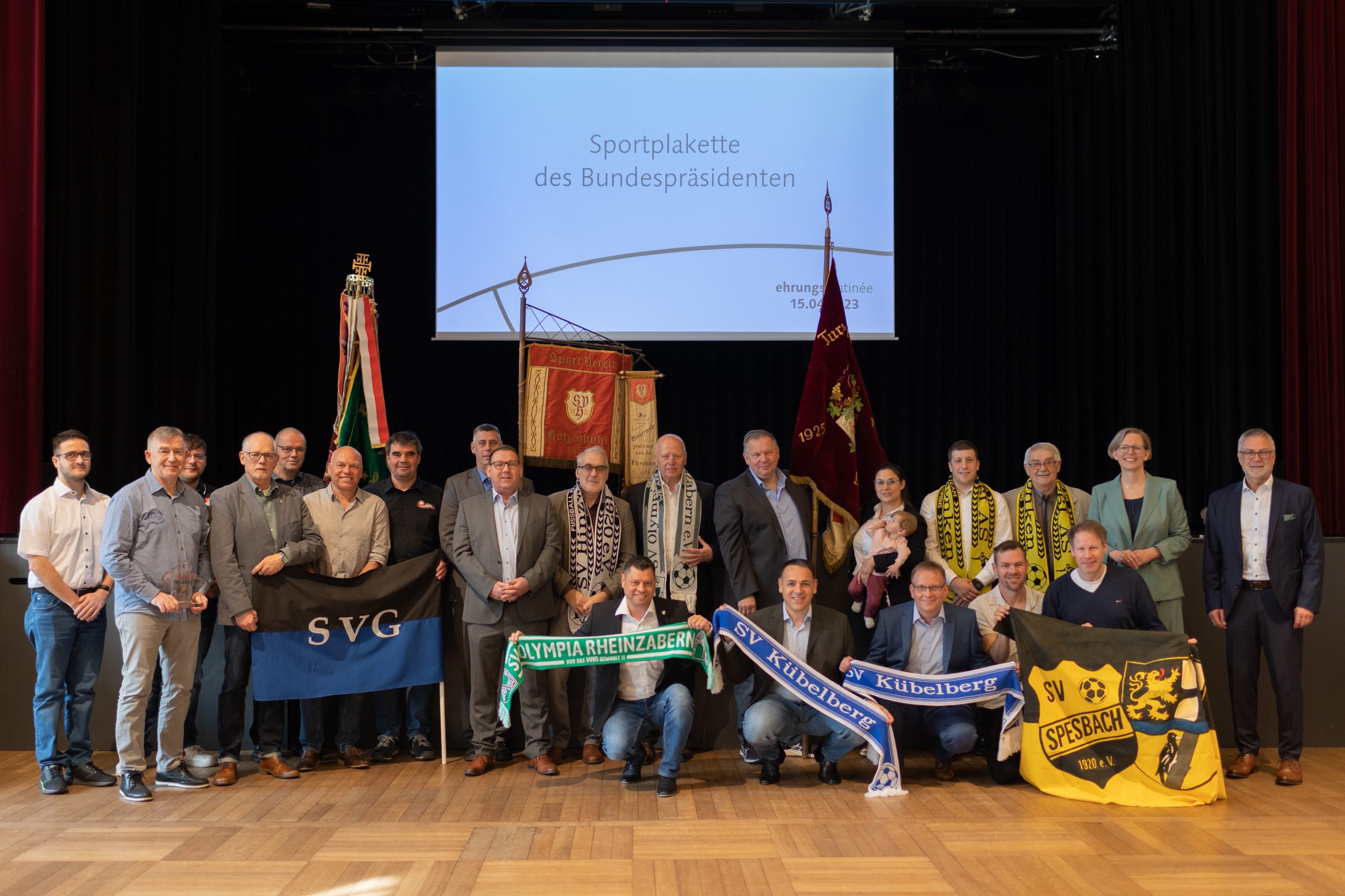Es wurde voll vor der Bühne, als Staatssekretärin Simone Schneider zusammen mit Sportbund Pfalz-Präsident Rudolf Storck die Sportplakette des Bundespräsidenten an insgesamt elf Vereine überreichte. In ihrem Grußwort würdigte die Staatssekretärin das Engagement der Sportvereine und forderte mehr Aufmerksamkeit für den Sport von Staat und Gesellschaft. Die Ehrungsmatinée bietet eine Bühne für das Ehrenamt, Freunde und Förderer des pfälzischen Sports und soll ein Dankeschön für deren herausragende Arbeit sein. Dass diese Menschen sich mit Leidenschaft für den Pfalzsport einsetzen, wurde auch deutlich, als einer der auf die Bühne gerufenen deutlich machte, wie sehr er sich über die Ehrung freue, »man sich nun aber auch etwas beeilen müsse« – ein Einsatz als Schiedsrichter am Nachmittag wartete auf ihn.